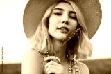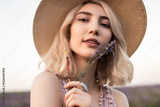 A close-up photograph of a woman wearing a hat and holding lavender flowers in a serene outdoor environment, evoking a sense of tranquility and natural beauty.