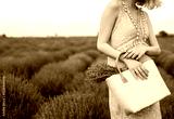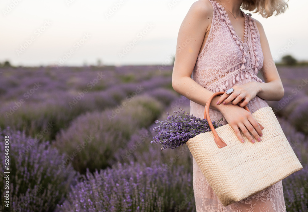 A feminine figure in a lace dress holds a straw basket filled with lavender flowers in a scenic lavender field, expressing calmness, beauty, and connection with nature's vibrant colors and serenity.