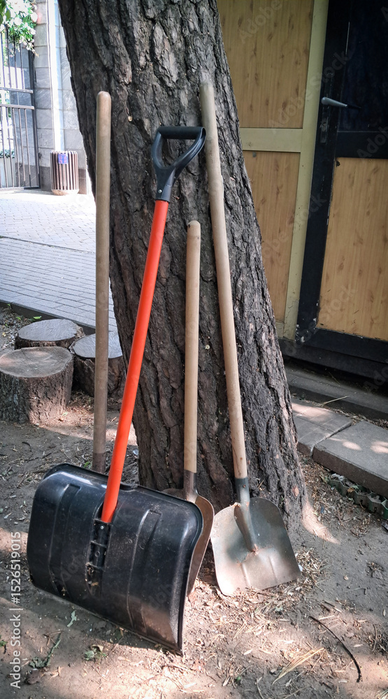Set of shovels and tools leaning against a tree outdoors, used for cleaning and yard work