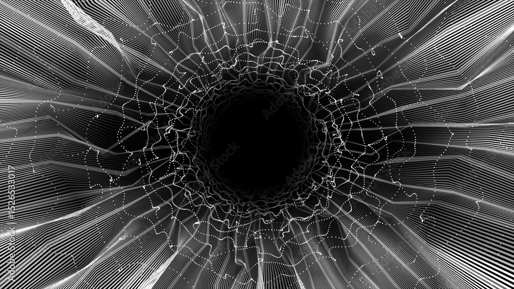 abstract hi-tech sci-fi wiggling parallel lines on black background, futuristic dark tunnel technology background