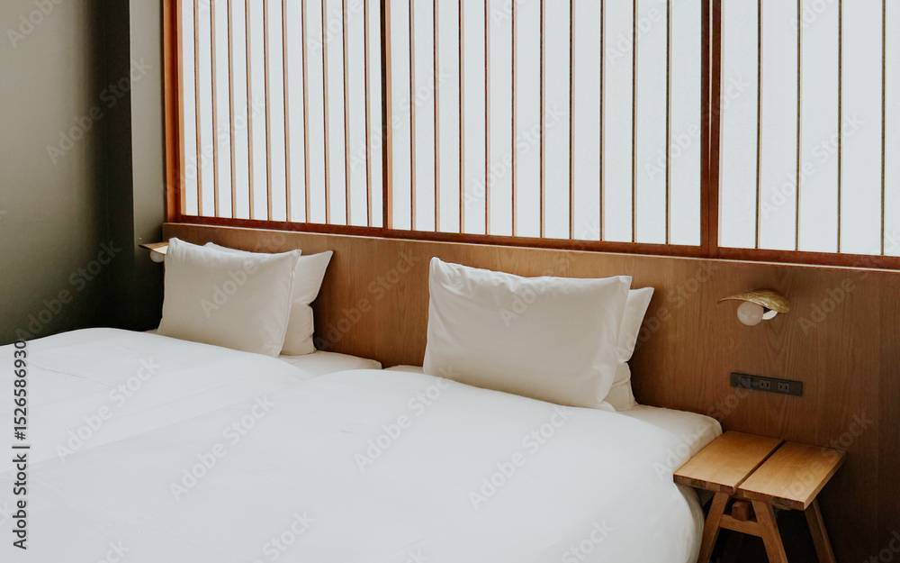 Minimalist Japanese hotel room with twin beds and soft white bedding, shoji screen. Modern ryokan interior