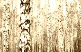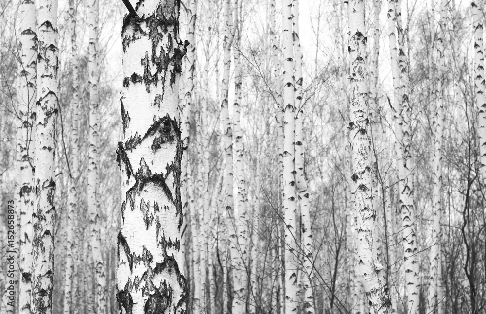 Black and white photo of birch grove in autumn as beautiful black-and-white wallpaper