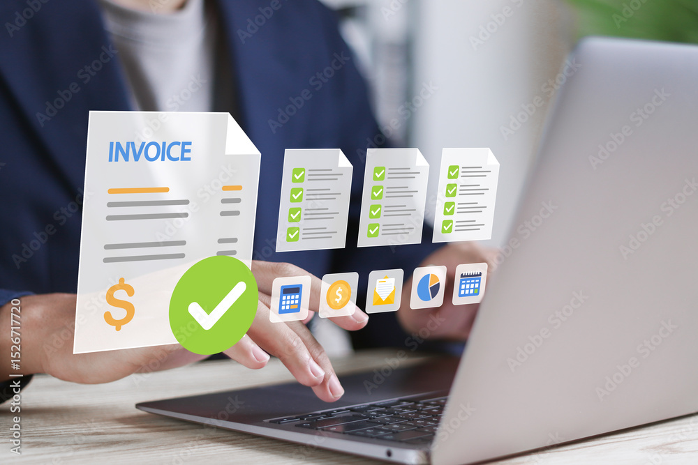 E-invoice and online digital statements concept, Electronic tax invoice. Businessman working with digital invoice management system on computer laptop.