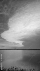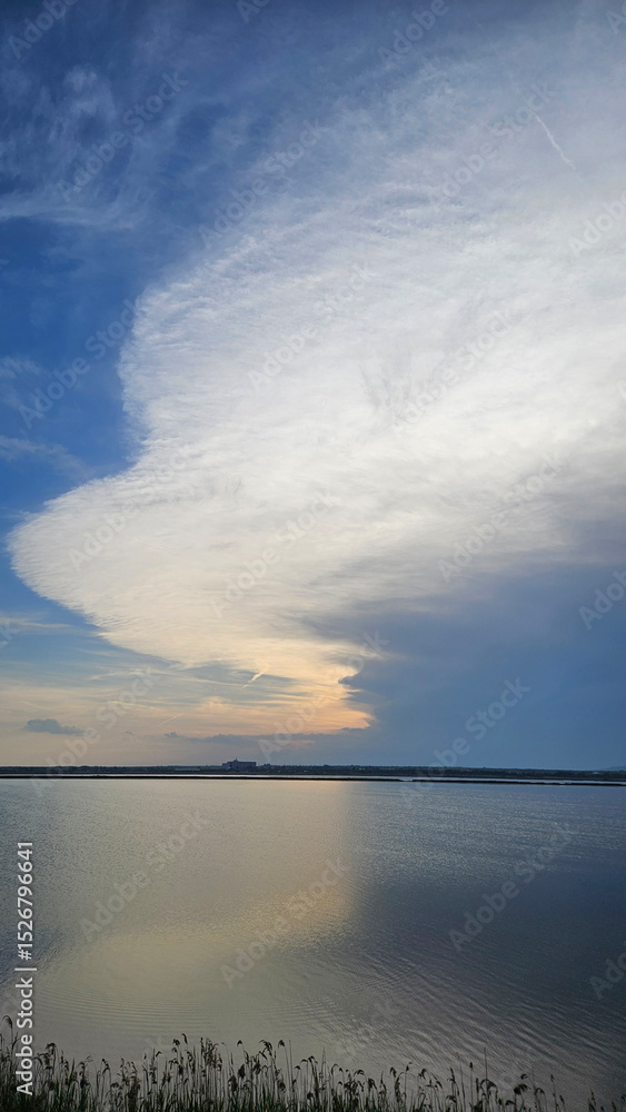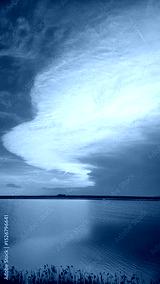 Landscape with unusually shaped white cloud in the evening sky over the lake