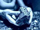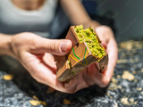 A detailed close up of a woman's hands breaking open the viral Dubai chocolate with its famous crunchy pistachio filling