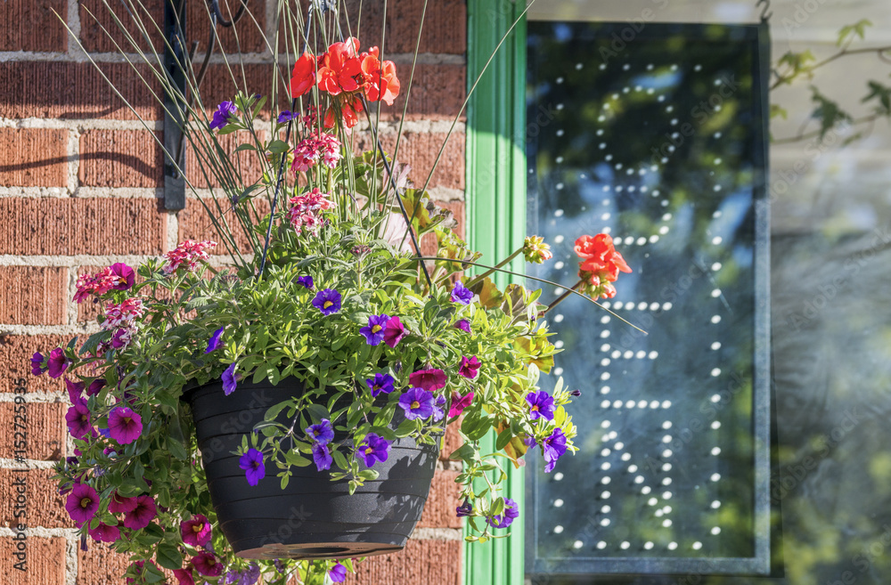 Petunia hanging basket outside store window with unlit open sign
