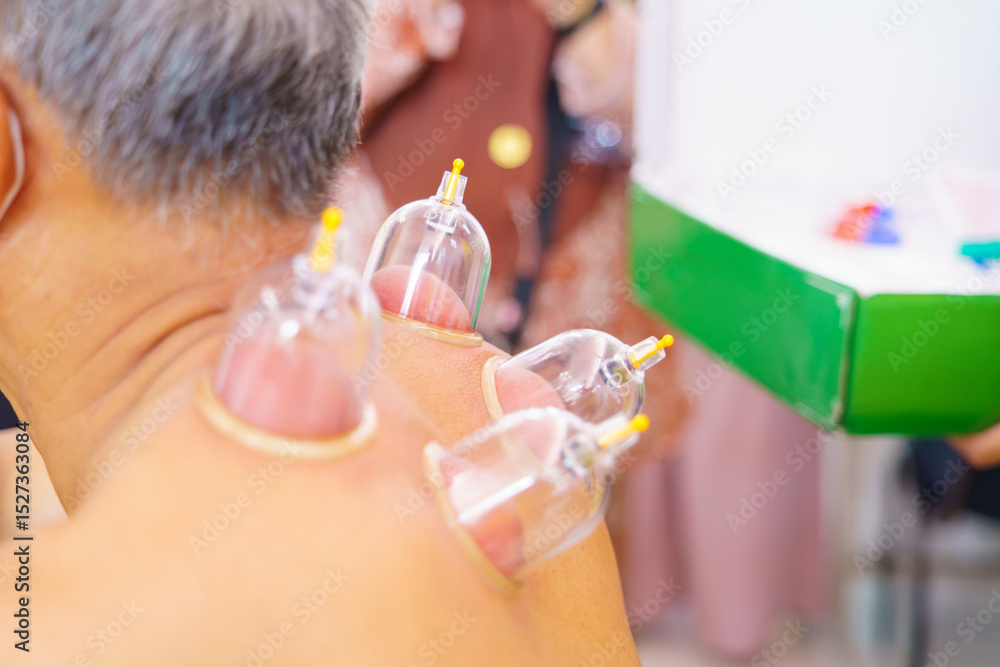 Close up for multiple vacuum cups, medical cupping therapy on human body. Doctor with cups for patient, therapy. Wellness, health injury rehabilitation concept. Alternative medicine