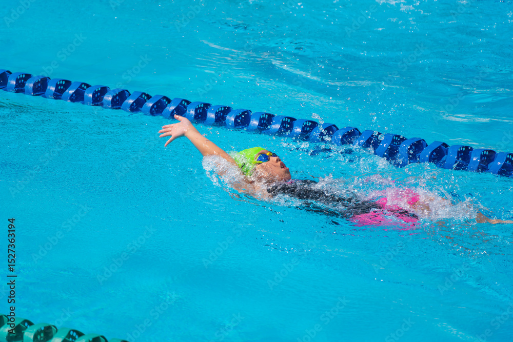 Swimmer child swims backstroke swimming style in a race swimming pool. Water sports and competition, learning to swim classes for children.