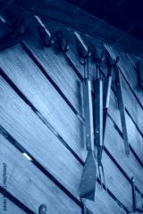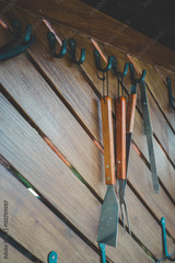 Set of barbecue tools with wooden handles hanging on black metal hooks mounted on diagonal wooden wall, outdoor cooking area detail