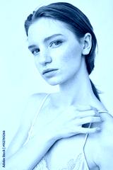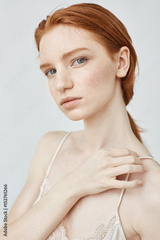 Portrait of tender beautiful redhead girl looking at camera over white wall.