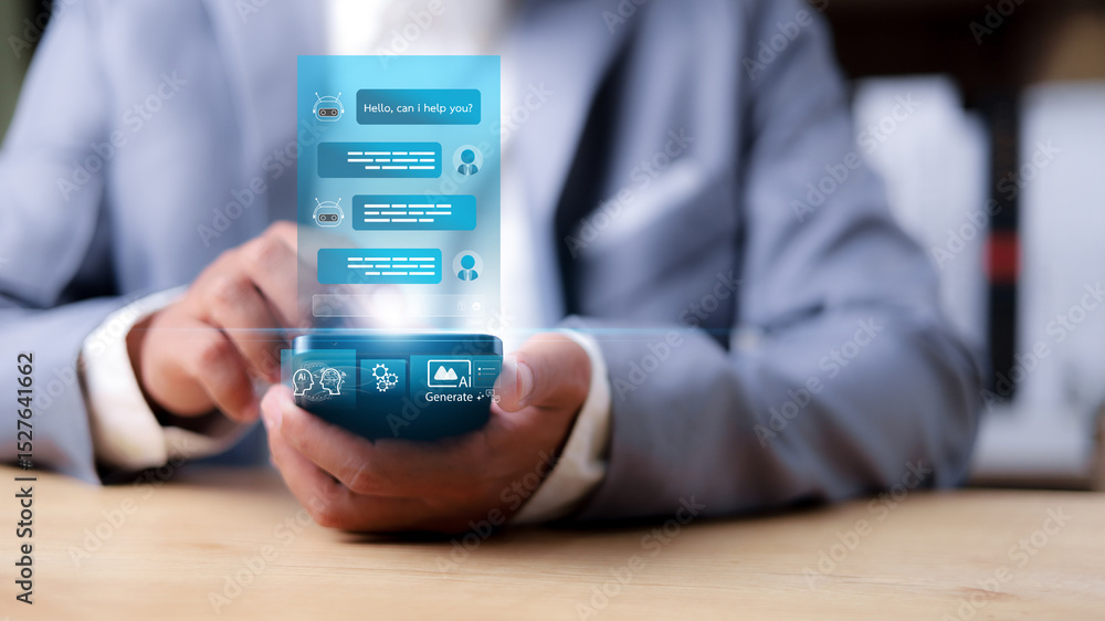 Businessman interacting with AI chatbot on smartphone, showing virtual conversation interface with messages and icons. Concept of artificial intelligence and digital assistant.