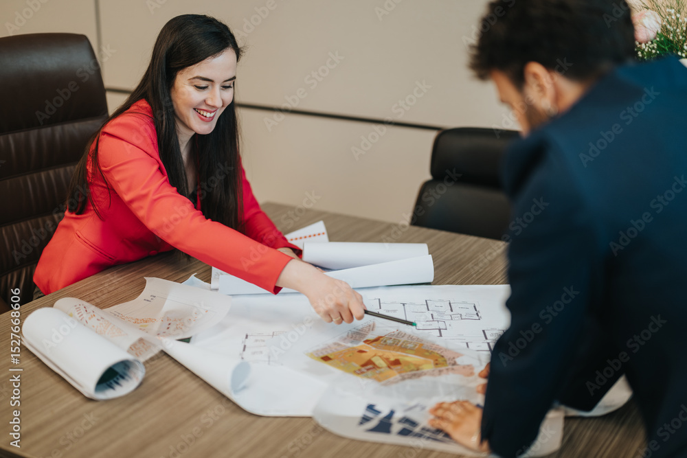 Two business people collaborating on architectural plans in a modern office environment. The image reflects teamwork, professional collaboration, and strategic planning in a corporate setting.