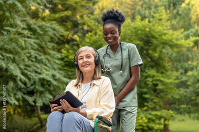 Woman on a wheelchair and nurse having a walk in the park