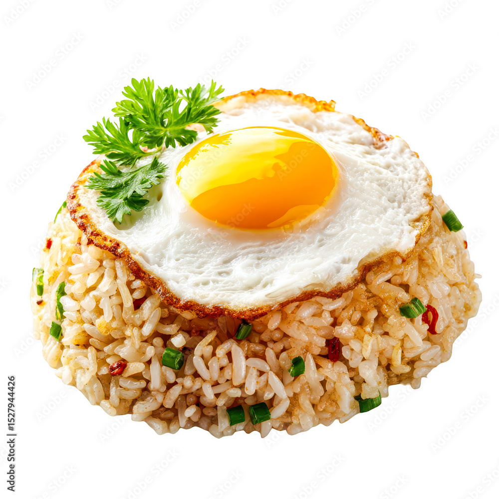 Fried Rice Topped with a Sunny Side Up Egg and Parsley, isolated on transparent background, perfect cutout, PNG