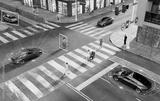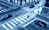 3D render of an urban scene with autonomous vehicles and people