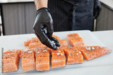 chef sprinkling black pepper and salt on a fresh salmon steak in the kitchen