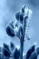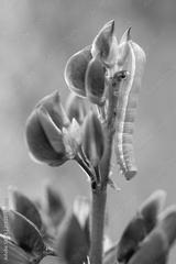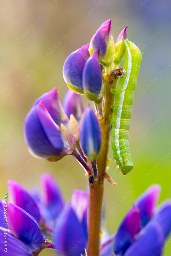 larva is green dotted with a yellowish white subdorsal line. Insect feeding on a lupine flower.