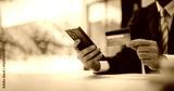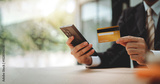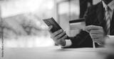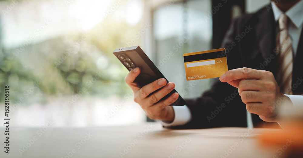 Close-up of a man filling in credit card information on a smartphone to complete a payment transaction. Online shopping, payment, login.
