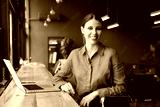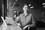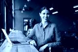 Portrait young it specialist latin hispanic business lady working on laptop pc sitting at desk in modern office smiling at camera. Middle eastern indian woman using computer technology for work online