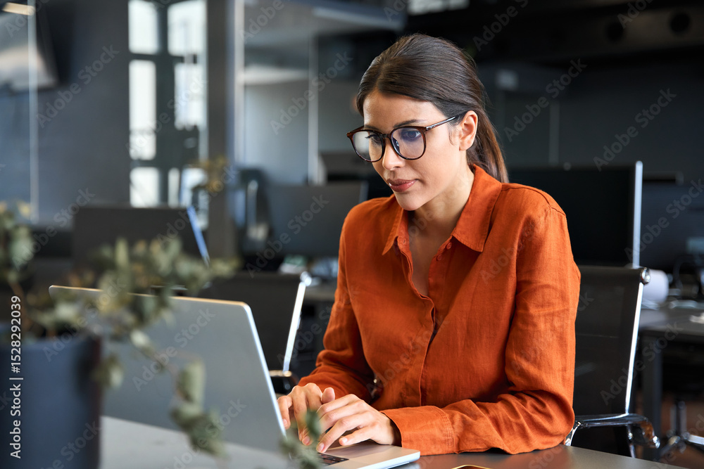 European mature woman in eyeglasses using computer for finance data analysing work online. Focused financial specialist latin hispanic businesswoman working on laptop pc sitting at desk in office.