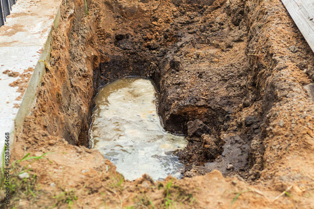 Leak from a broken water pipe in a trench near a construction site causing disruption and potential damage