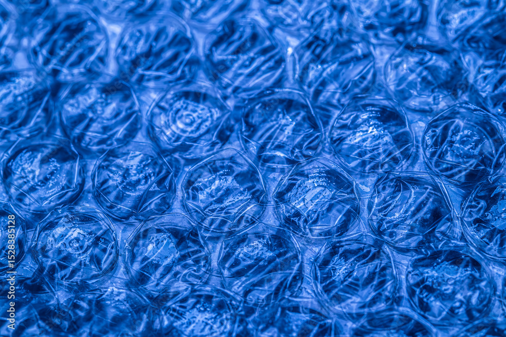 Bubble wrap macro photo with selective focus. It is a pliable transparent plastic material with bubbles of air used for packing fragile items. Close-up texture