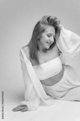 Embracing Serenity in a Minimalist Studio, a Joyful Woman Adorned in White Capturing the Essence of Comfort and Style in a Timeless Pose
