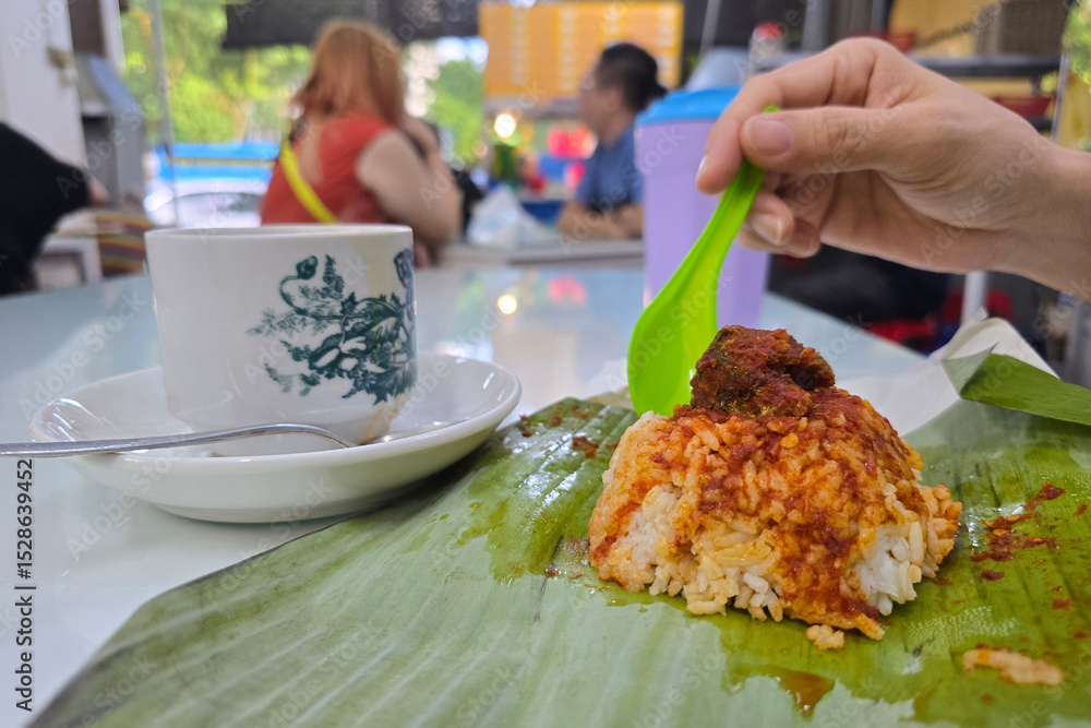 Close-up of a nasi lemak wrapped in banana leaf with sambal and meat, served alongside a vintage kopitiam-style coffee cup on a table in a local eatery in Malaysia.