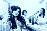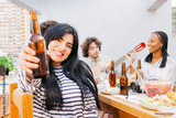 Gathering of friends singing and playing guitar, young Latin woman toasts and looking at the camera