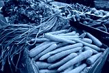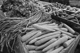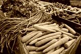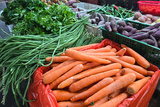 Close-up of fresh carrots, long beans, leafy greens, and purple sweet potatoes neatly arranged at a local market vegetable stall.