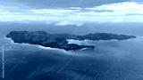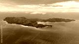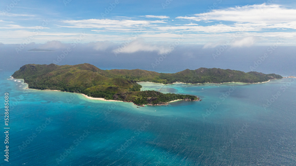 A scenic aerial view of a tropical island with turquoise waters surrounding white sandy beaches and lush greenery. Curieuse, Seychelles.