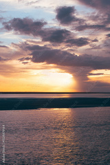 Majestic sunset over serene water with dramatic clouds and reflections in a tranquil coastal landscape