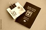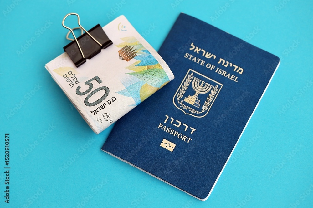 Israel New Shekels banknotes and passport on blue background. The current Israel money bills