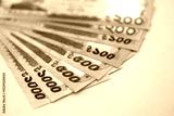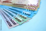 Bangladeshi taka money bills in big amount lies on teal color table close up