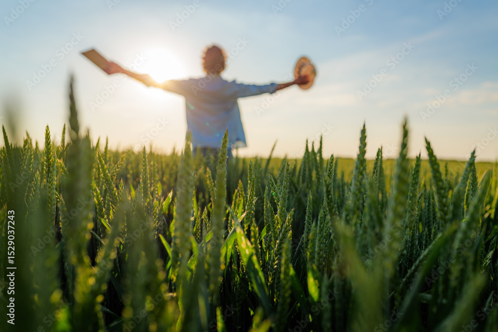 Happy farmer is holding a hat and a tablet while enjoying the sunset over a beautiful green wheat field, expressing freedom and success in agriculture