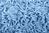 Detailed close-up shot captures the texture of raw, light pink ground meat, showing its individual strands and subtle marbling