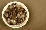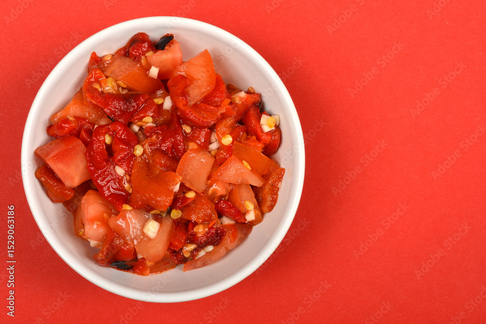 A white bowl filled with a vibrant salad of roasted red peppers, tomatoes, and garlic is positioned on a striking red background with ample copy space