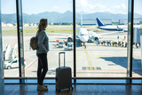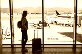 Woman with suitcase waiting at airport terminal before boarding airplane, solo travel passenger ready for flying to summer vacation