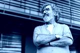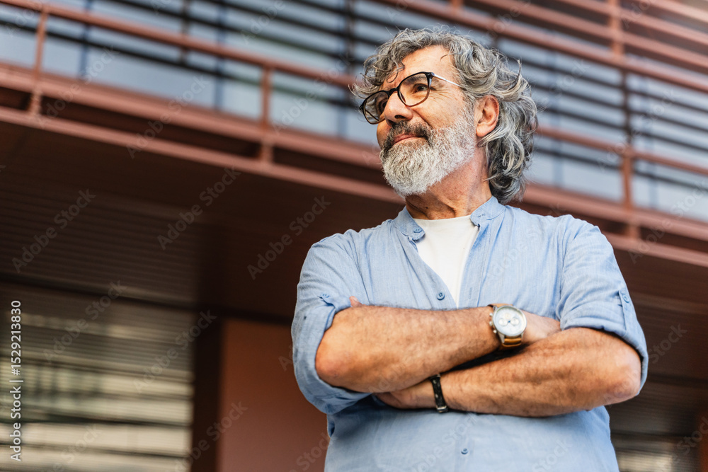 Thoughtful senior man standing with crossed arms looking to the side in the city