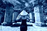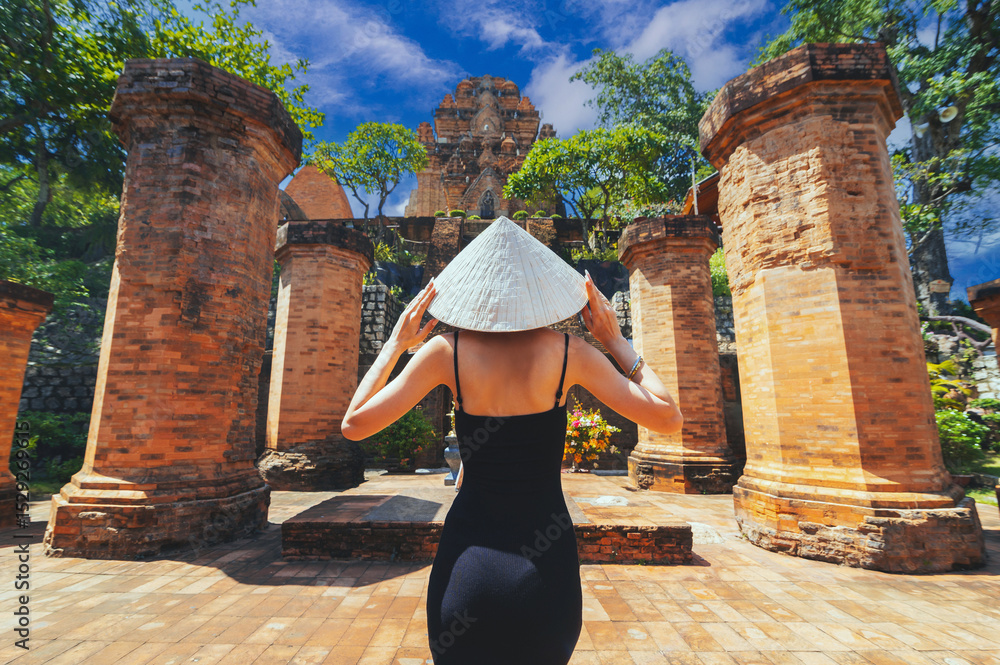 A female tourist stands with her back against the background View of Po Nagar Cham towers complex.