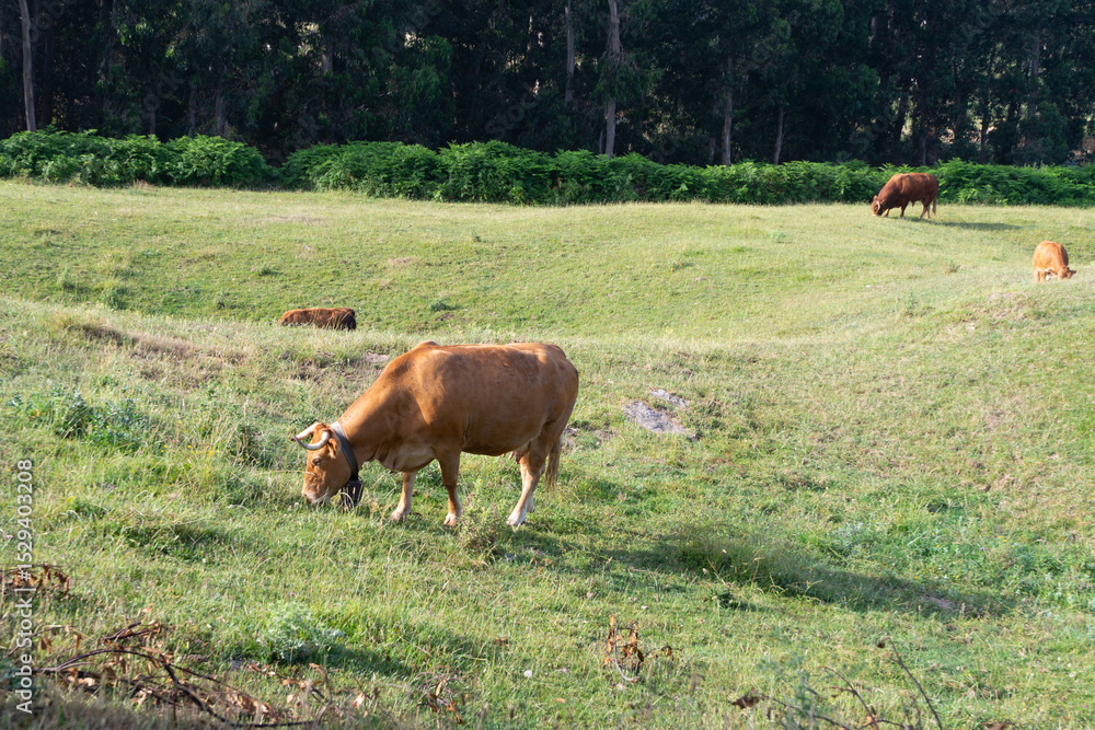 brown cow grazing in green meadow eating grass.