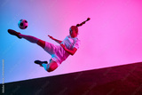 Dynamic photo. Young female footballer performing flying side kick in air with braided hair and full focus under pink blue neon light. Concept of sport, agility, performance, athletic excellence.