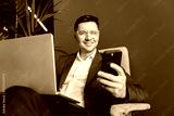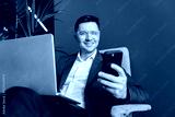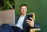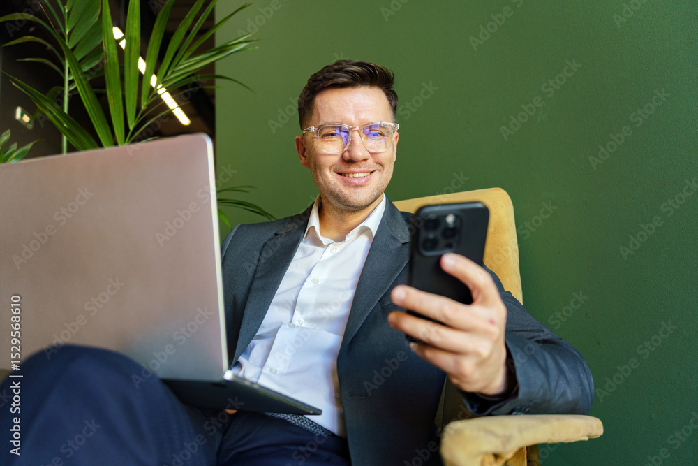 Professional Man Engaged in Mobile Communication While Working on a Laptop in a Modern Office Setting During Daylight Hours