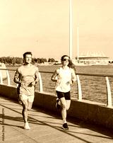 Running Along the Waterfront, Two Energetic Joggers Embrace the Sunset Glow on a Beautiful Afternoon in the City