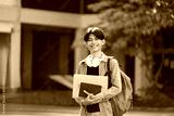 A cheerful Asian college student stands outside on campus with a backpack, smiling and looking at the camera.