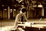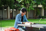 Portrait of a young Asian male college student e-learning using laptop on the bench on campus.