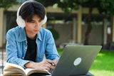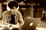 Portrait of a young Asian male college student e-learning using laptop on the bench on campus.