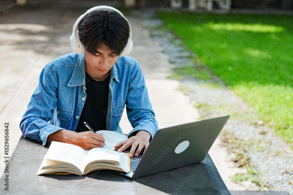 Portrait of a young Asian male college student e-learning using laptop on the bench on campus.