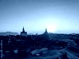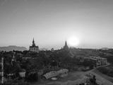Aerial view beautiful sunrise above Big White Five buddha Statues in Wat Phra That Pha Son Kaew temple at Phetchabun Thailand.