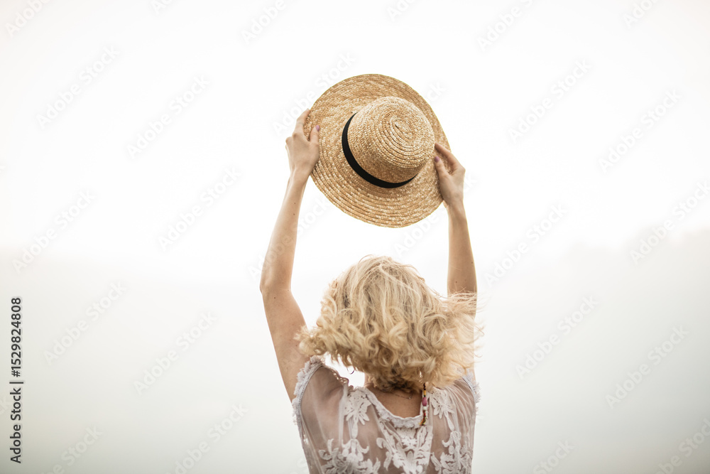A woman with blonde hair holding a straw hat above her head in an outdoor, natural setting, surrounded by warm sunlight, signifying freedom, relaxation, and connection with nature during a pleasant